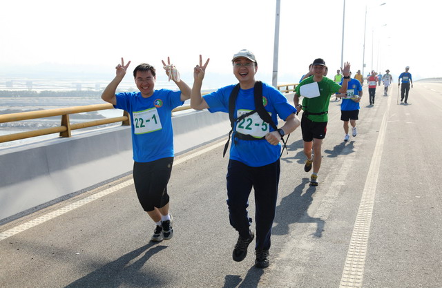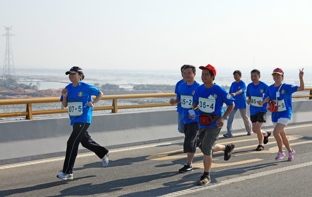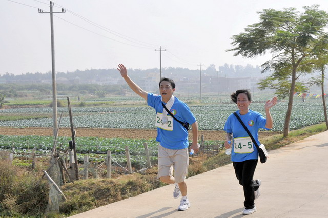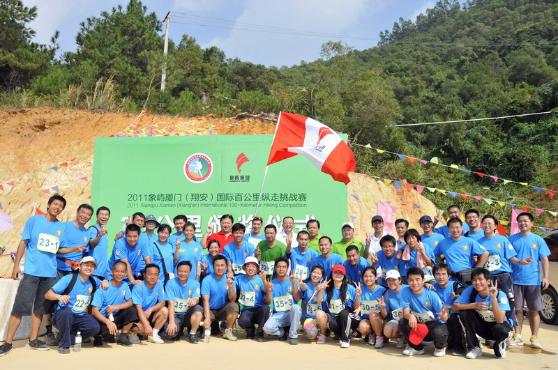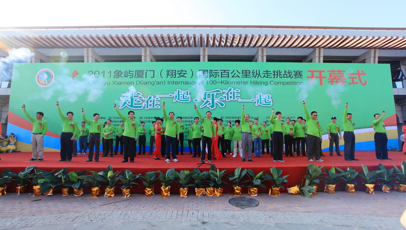 11月5日8時(shí)09分,明媚秋光里,廈門市委常委、副市長臧杰斌宣布2011象嶼廈門(翔安)國際百公里縱走挑戰(zhàn)賽開始,廈門市人大常委會(huì)副主任黃杰成、廈門市政協(xié)副主席陳昌生、國家奧林匹克體育中心副主任彭維勇、象嶼集團(tuán)總裁張水利等一起為比賽鳴槍。來自28個(gè)國家和地區(qū)的近萬名運(yùn)動(dòng)愛好者,從大嶝小鎮(zhèn)·臺(tái)灣免稅公園廣場出發(fā),穿越田野、海濱、山巒、閩南古厝,開始了一段挑戰(zhàn)自我的征途。這其中,由象嶼集團(tuán)員工及家屬、合作伙伴、共建單位等組成的千人象嶼團(tuán)隊(duì)分外引人注目,浩浩蕩蕩的象嶼人走在一起、樂在一起,在欣賞沿途自然、人文風(fēng)光的同時(shí),也享受著挑戰(zhàn)自我、永不止步的健康向上,享受著與同事、親朋共度美好秋假的怡然歡樂。