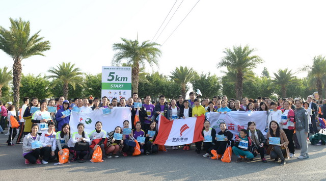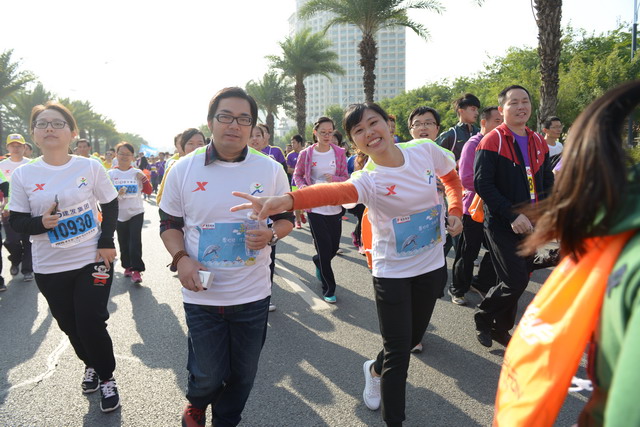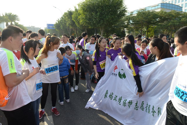 盡管冬日清晨有些凍人,但這絲毫沒有“凍”壞象嶼人的熱情。一進(jìn)入賽場(chǎng),大家就摩拳擦掌,躍躍欲試。今年的馬拉松對(duì)象嶼跑團(tuán)而言,有著特殊的意義,這不僅是一場(chǎng)健康跑,更是一場(chǎng)公益跑。此次比賽跑道恰好與火燒嶼隔海相望,由集團(tuán)捐資建立的中華白海豚救護(hù)繁育基地正坐落島上。白海豚的可愛形象也隨之出現(xiàn)在象嶼“跑男”“跑女”的前胸、后背。公益旗幟、白海豚公益宣傳貼紙,紅帆logo,以及我們朝氣蓬勃的象嶼跑團(tuán)組成了一道“有愛”的風(fēng)景線。這也吸引了周圍許多馬拉松參賽者的目光,有的參賽者甚至圍上前來詢問是否也能加入其中。于是,象嶼救助白海豚的公益之舉隨著象嶼人的奔跑也一路傳播開來。