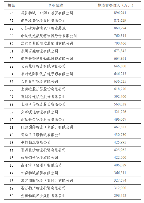 2018年中國(guó)物流企業(yè)50強(qiáng)名單