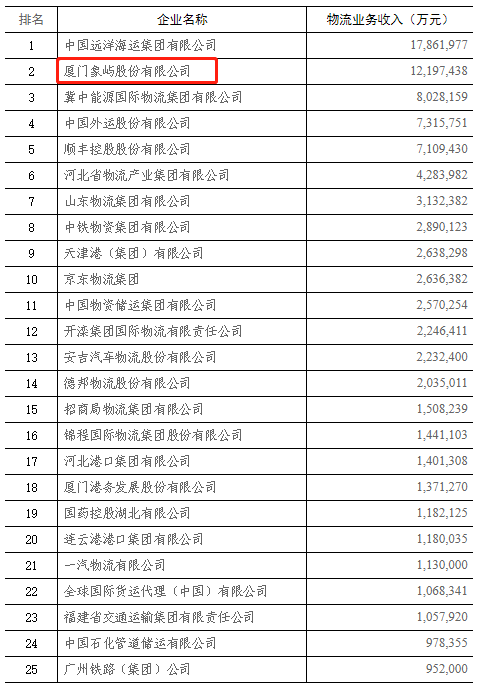 11月23日,中國(guó)物流與采購(gòu)聯(lián)合會(huì)公布了2018年度中國(guó)物流企業(yè)50強(qiáng)排名,象嶼股份位列第2,較上一年前進(jìn)兩位。