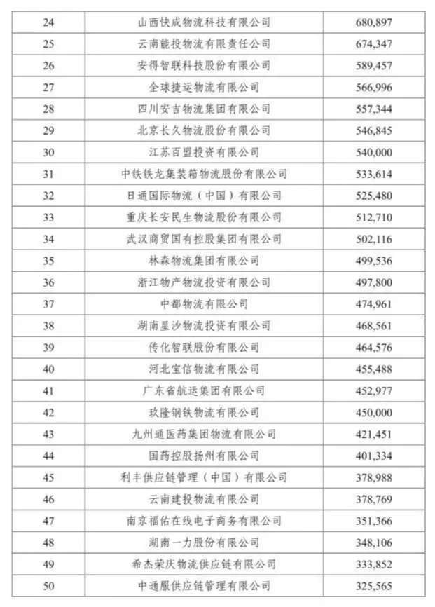 該榜單由中國(guó)物流與采購(gòu)聯(lián)合會(huì)組織評(píng)選,按照重點(diǎn)物流企業(yè)統(tǒng)計(jì)調(diào)查結(jié)果提出了2019年度中國(guó)物流企業(yè)50強(qiáng)排名。據(jù)悉, 50強(qiáng)物流企業(yè)2018年物流業(yè)務(wù)收入合計(jì)9833億元,按可比口徑計(jì)算,同比增長(zhǎng)16.9%。50強(qiáng)物流企業(yè)門(mén)檻提高到32.6億元,比上年增加3億元。