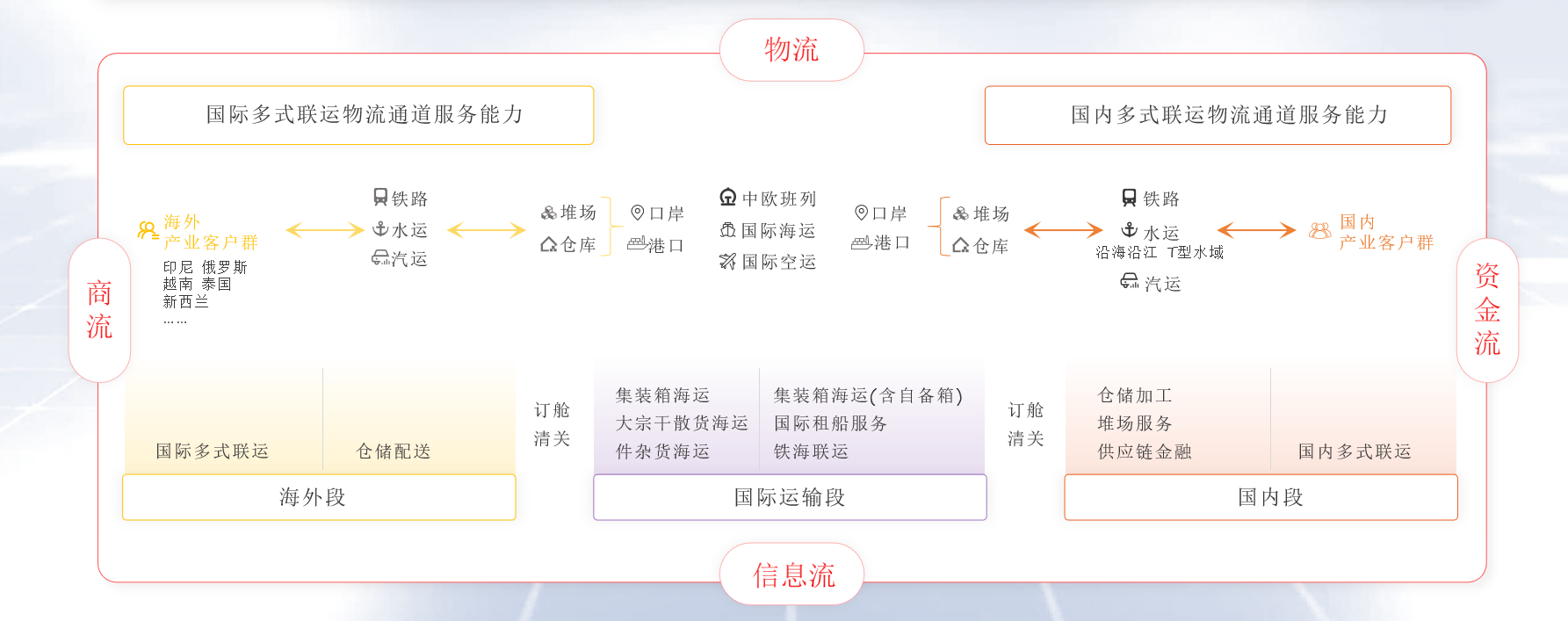 象嶼股份率先構(gòu)建了以“公、鐵、水、倉”為支撐,覆蓋全國、連接海外的網(wǎng)絡(luò)化物流服務(wù)體系,并以“鐵、水”做干線、公路做兩端的經(jīng)營思路,為客戶提供定制化多式聯(lián)運解決方案,實現(xiàn)一站式門到門運輸。目前,公司已經(jīng)打造出“北糧南運”“鋁產(chǎn)品跨省流通”“北煤南運”等多條多式聯(lián)運物流線路。