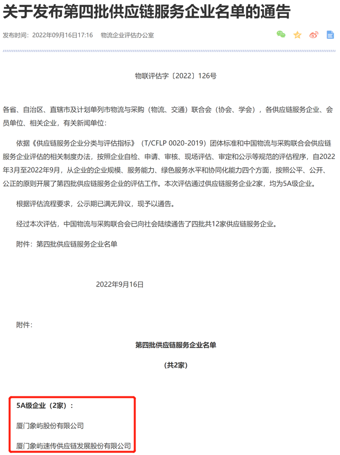 近日,象嶼股份及旗下象嶼速傳通過“5A級供應(yīng)鏈服務(wù)企業(yè)”評估,這也是目前福建省僅有的2家通過該評估的企業(yè)。